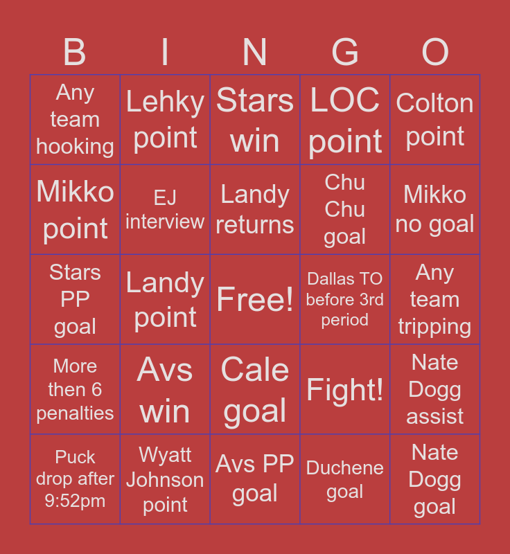 This bingo card has a free space and 24 words: Avs win, Wyatt Johnson point, Landy returns, Puck drop after 9:52pm, Colton point, Any team hooking, Mikko point, Lehky point, Dallas TO before 3rd period, Cale goal, Chu Chu goal, Stars PP goal, Fight!, Nate Dogg assist, EJ interview, Duchene goal, Any team tripping, Stars win, Mikko no goal, Landy point, Nate Dogg goal, More then 6 penalties, LOC point and Avs PP goal.