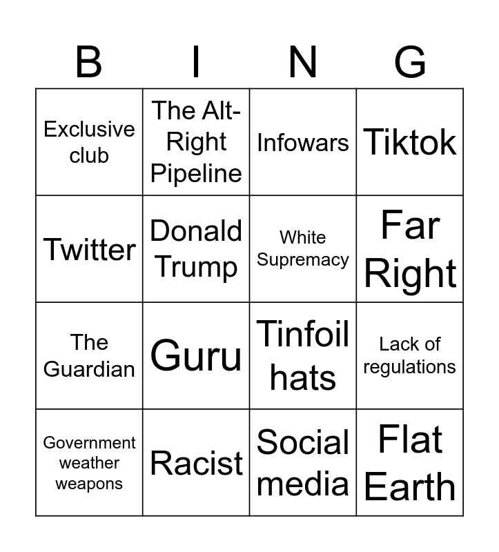 This bingo card has 32 words: CPR, Homophobic, Lack of regulations, Repellent ideas, Flat Earth, White Supremacy, Twitter, Andrew Tate, The Alt-Right Pipeline, Gay frogs, Far Right, Infowars, Antivaxxers, Teenage Boys, Racist, Hate and prejudice, Fake Moon Landing, Tinfoil hats, Misogyny, Community, Human trafficking, Mass shootings, Social media, Youtube, Government weather weapons, Tiktok, The Guardian, Donald Trump, Exclusive club, Ben Shapiro, Insecure Boys and Guru.