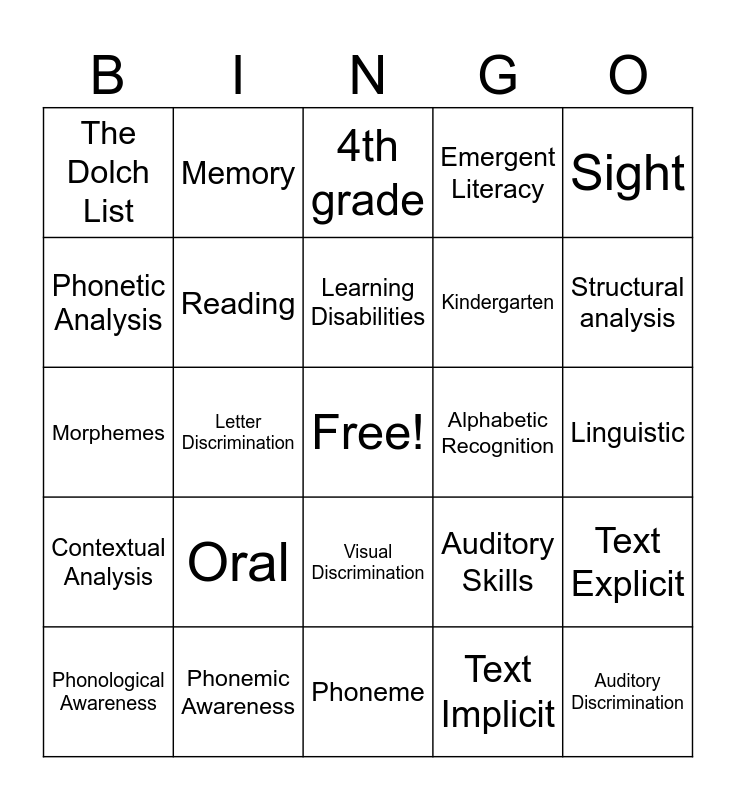 This bingo card has a free space and 24 words: Oral, Phonemic Awareness, Learning Disabilities, Phonological Awareness, Sight, The Dolch List, Phonetic Analysis, Memory, Alphabetic Recognition, Visual Discrimination, Kindergarten, Morphemes, Auditory Skills, Text Explicit, Reading, Text Implicit, Linguistic, 4th grade, Structural analysis, Letter Discrimination, Auditory Discrimination, Contextual Analysis, Emergent Literacy and Phoneme.