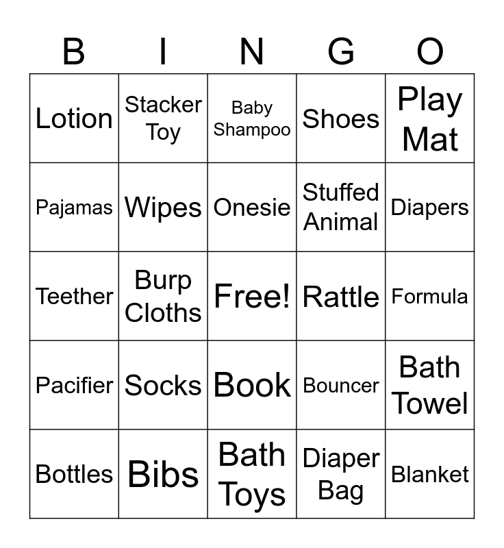 This bingo card has a free space and 24 words: Socks, Bibs, Onesie, Bottles, Play Mat, Lotion, Pajamas, Stacker Toy, Rattle, Book, Stuffed Animal, Teether, Bouncer, Bath Towel, Wipes, Diaper Bag, Formula, Baby Shampoo, Diapers, Burp Cloths, Blanket, Pacifier, Shoes and Bath Toys.