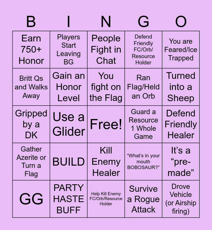 This bingo card has a free space and 24 words: BUILD, PARTY HASTE BUFF, You fight on the Flag, GG, You are Feared/Ice Trapped, Earn 750+ Honor, Britt Qs and Walks Away, Players Start Leaving BG, Guard a Resource 1 Whole Game, Kill Enemy Healer, Ran Flag/Held an Orb, Gripped by a DK, “What’s in your mouth BOBOSAUR?”, It’s a “pre-made”, Gain an Honor Level, Survive a Rogue Attack, Defend Friendly Healer, People Fight in Chat, Turned into a Sheep, Use a Glider, Drove Vehicle (or Airship firing), Gather Azerite or Turn a Flag, Defend Friendly FC/Orb/ Resource Holder and Help Kill Enemy FC/Orb/Resource Holder.