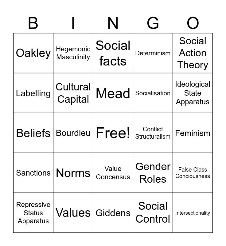 This bingo card has a free space and 24 words: Norms, Values, Mead, Repressive Status Apparatus, Social Action Theory, Oakley, Labelling, Hegemonic Masculinity, Conflict Structuralism, Value Concensus, Socialisation, Beliefs, Gender Roles, False Class Conciousness, Cultural Capital, Social Control, Feminism, Social facts, Ideological State Apparatus, Bourdieu, Intersectionality, Sanctions, Determinism and Giddens.
