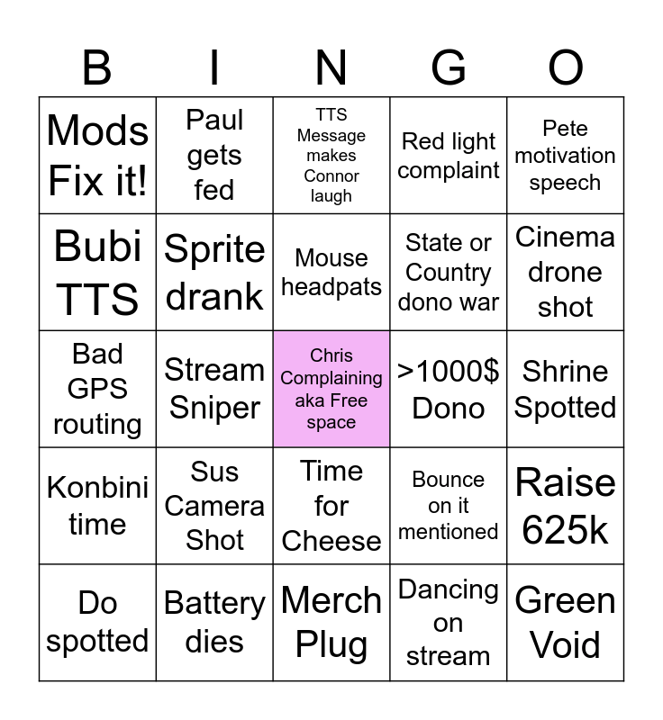 This bingo card has a free space and 24 words: Sus Camera Shot, Battery dies, Mouse headpats, Do spotted, Pete motivation speech, Mods Fix it!, Bubi TTS, Paul gets fed, >1000$ Dono, Time for Cheese, State or Country dono war, Bad GPS routing, Bounce on it mentioned, Raise 625k, Sprite drank, Dancing on stream, Shrine Spotted, TTS Message makes Connor laugh, Cinema drone shot, Stream Sniper, Green Void, Konbini time, Red light complaint and Merch Plug.