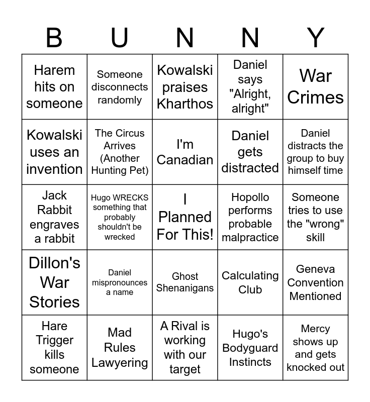 This bingo card has a free space and 29 words: Hare Trigger kills someone, Hare Trigger knocks someone out, Hugo WRECKS something that probably shouldn't be wrecked, Someone makes a rabbit pun, Harem hits on someone, Kowalski praises Kharthos, The Circus Arrives (Another Hunting Pet), Daniel mispronounces a name, Hopollo performs probable malpractice, Mad Rules Lawyering, Someone tries to use the "wrong" skill, Mercy shows up and gets knocked out, A Rival is working with our target, Hugo's Bodyguard Instincts, Daniel distracts the group to buy himself time, Harem adds to his business card, Ghost Shenanigans, Dillon's War Stories, War Crimes, Jack Rabbit engraves a rabbit, Calculating Club, Skovland PRIDE, Daniel gets distracted, Kowalski uses an invention, Daniel says "Alright, alright", Someone disconnects randomly, Geneva Convention Mentioned, I'm Canadian and American Politics.