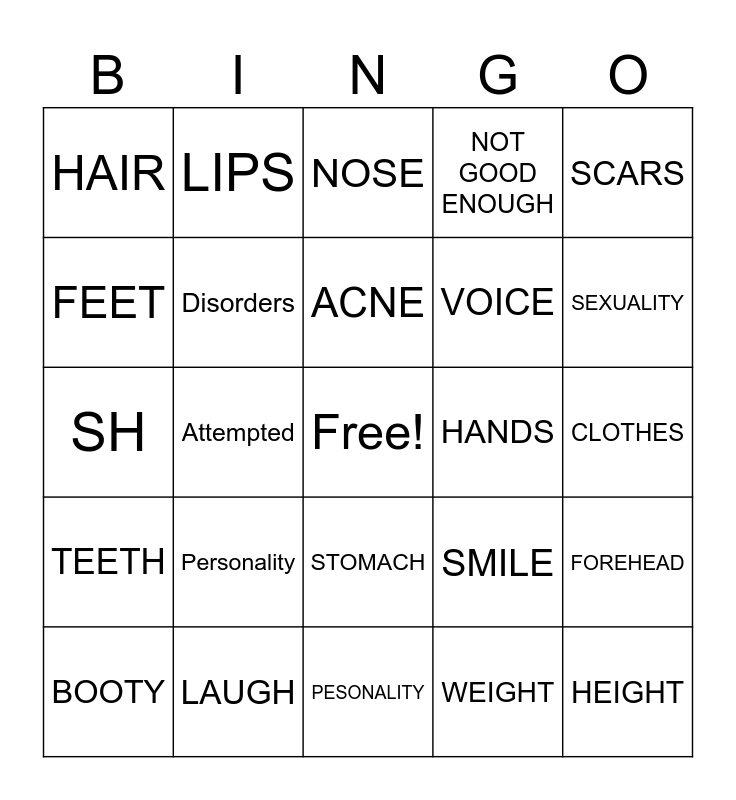 This bingo card has a free space and 24 words: Personality, LAUGH, ACNE, BOOTY, SCARS, HAIR, FEET, LIPS, HANDS, STOMACH, VOICE, SH, SMILE, FOREHEAD, Disorders, WEIGHT, CLOTHES, NOSE, SEXUALITY, Attempted, HEIGHT, TEETH, NOT GOOD ENOUGH and PESONALITY.