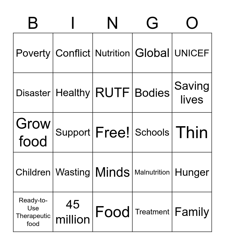 This bingo card has a free space and 24 words: Wasting, 45 million, RUTF, Ready-to-Use Therapeutic food, UNICEF, Poverty, Disaster, Conflict, Schools, Minds, Bodies, Grow food, Malnutrition, Hunger, Healthy, Treatment, Thin, Nutrition, Saving lives, Support, Family, Children, Global and Food.