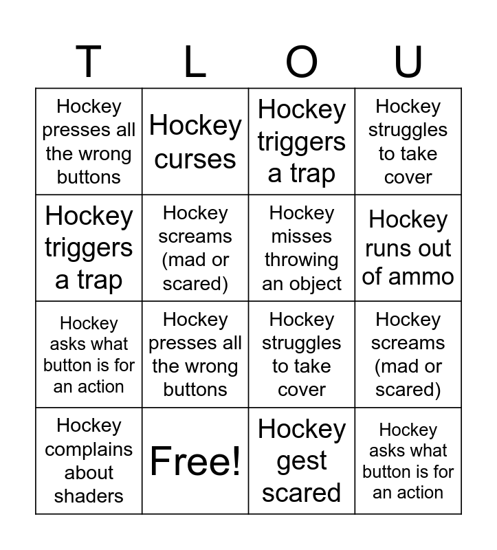 ⚠ This card has duplicate items: Hockey dies (2), Hockey misses throwing an object (2), Hockey runs out of ammo (2), Hockey gest scared (2), Hockey triggers a trap (2), Hockey presses all the wrong buttons (2), Hockey screams (mad or scared) (2), Hockey complains about shaders (2), Hockey asks what button is for an action (2), Hockey struggles to take cover (2), Oscar interferes with Hockey (2)