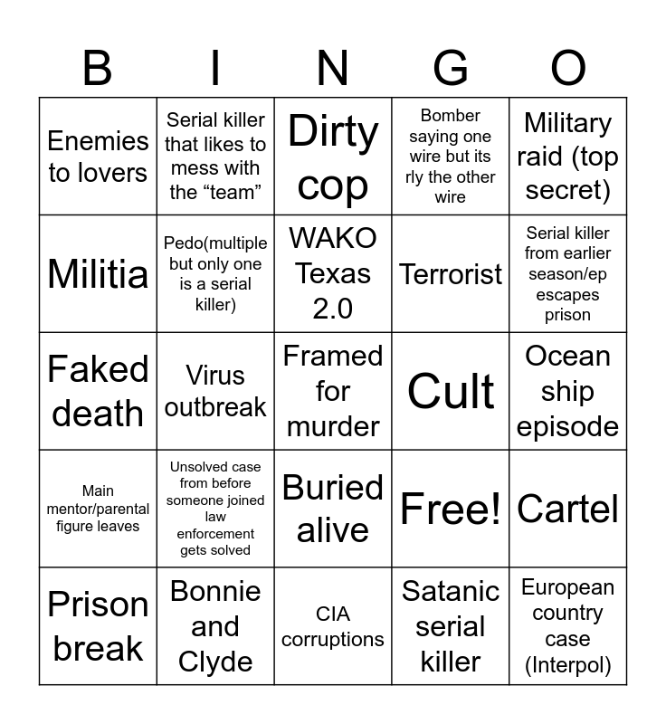 This bingo card has 25 words: Unsolved case from before someone joined law enforcement gets solved, CIA corruptions, WAKO Texas 2.0, Prison break, Military raid (top secret), Enemies to lovers, Militia, Serial killer that likes to mess with the “team”, Cult, Buried alive, Terrorist, Faked death, Free!, Cartel, Pedo(multiple but only one is a serial killer), European country case (Interpol), Ocean ship episode, Dirty cop, Serial killer from earlier season/ep escapes prison, Virus outbreak, Framed for murder, Bonnie and Clyde, Main mentor/parental figure leaves, Bomber saying one wire but its rly the other wire and Satanic serial killer.