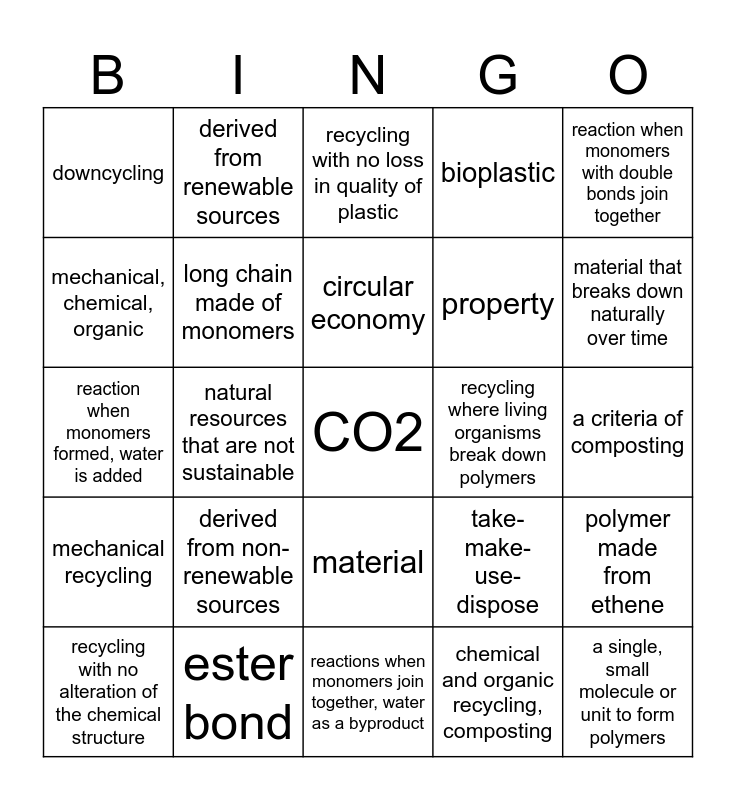 This bingo card has 25 words: derived from non-renewable sources, reactions when monomers join together, water as a byproduct, circular economy, recycling with no alteration of the chemical structure, reaction when monomers with double bonds join together, downcycling, mechanical, chemical, organic, derived from renewable sources, recycling where living organisms break down polymers, material, property, reaction when monomers formed, water is added, take-make-use-dispose, polymer made from ethene, long chain made of monomers, a single, small molecule or unit to form polymers, a criteria of composting, recycling with no loss in quality of plastic, material that breaks down naturally over time, natural resources that are not sustainable, CO2, ester bond, mechanical recycling, bioplastic and chemical and organic recycling, composting.