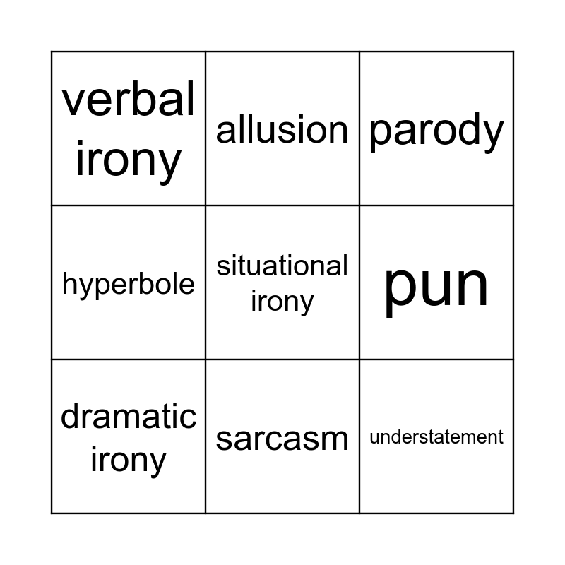 This bingo card has a free space and 8 words: pun, parody, allusion, dramatic irony, verbal irony, understatement, hyperbole and sarcasm.