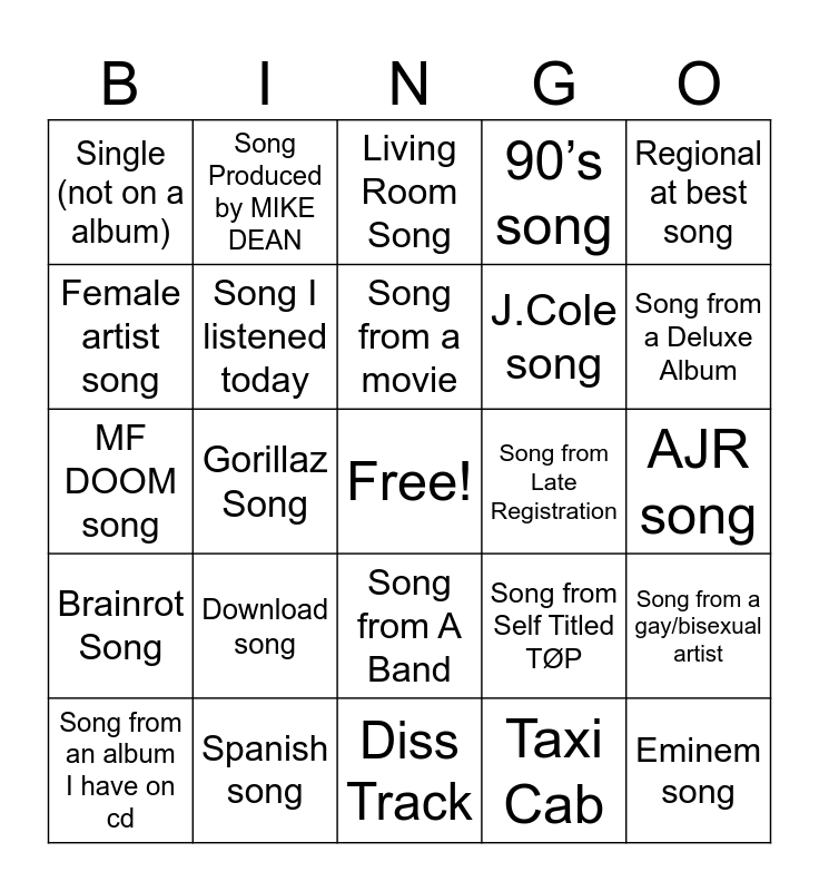 This bingo card has a free space and 24 words: Download song, Spanish song, Song from a movie, Song from an album I have on cd, Regional at best song, Single (not on a album), Female artist song, Song Produced by MIKE DEAN, Song from Late Registration, Song from A Band, J.Cole song, MF DOOM song, Song from Self Titled TØP, Song from a gay/bisexual artist, Song I listened today, Taxi Cab, AJR song, Living Room Song, Song from a Deluxe Album, Gorillaz Song, Eminem song, Brainrot Song, 90’s song and Diss Track.