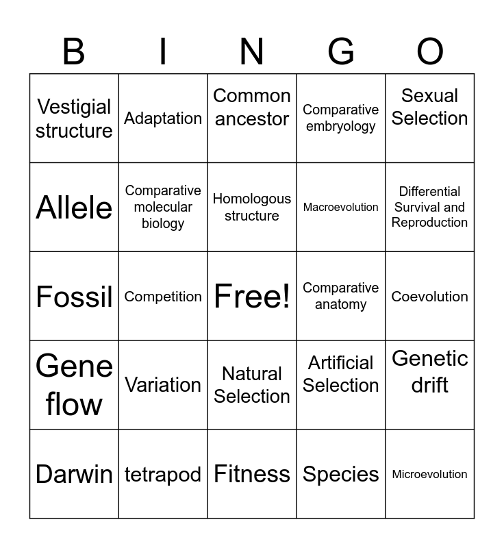 This bingo card has a free space and 24 words: Variation, tetrapod, Homologous structure, Darwin, Sexual Selection, Vestigial structure, Allele, Adaptation, Comparative anatomy, Natural Selection, Macroevolution, Fossil, Artificial Selection, Genetic drift, Comparative molecular biology, Species, Coevolution, Common ancestor, Differential Survival and Reproduction, Competition, Microevolution, Gene flow, Comparative embryology and Fitness.