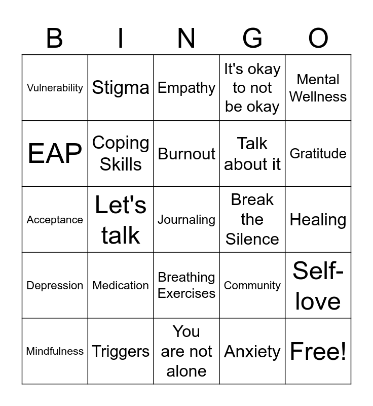 This bingo card has 34 words: Free!, Anxiety, Therapy, Self-Care, Depression, Coping Skills, Mental Wellness, Mindfulness, Stigma, Resilience, Burnout, Empathy, Recovery, Stress, Break the Silence, Gratitude, Triggers, Acceptance, Medication, Community, Breathing Exercises, Safe Space, Vulnerability, Healing, You are not alone, Journaling, It's okay to not be okay, Peer Support, Talk about it, EAP, Inner peace, Let's talk, Self-love and Mental Health Matters.