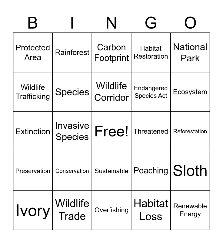 This bingo card has a free space and 34 words: Endangered, Habitat Loss, Biodiversity, Pollution, Preservation, Species, National Park, Ivory, Rainforest, Illegal Hunting, Wildlife Corridor, Carbon Footprint, Recycling, Sanctuary, Threatened, Ecosystem, Wildlife Trade, Extinction, Conservation, Poaching, Sustainable, Marine Life, Protected Area, Reforestation, Overfishing, Renewable Energy, Habitat Restoration, Ecotourism, Endangered Species Act, Wildlife Trafficking, Conservation Biology, Invasive Species, Sloth and Giraffe.