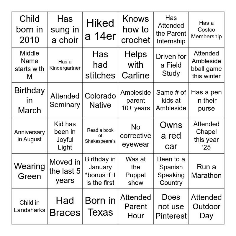 This bingo card has 36 words: Was at the Puppet show, Birthday in January *bonus if it is the first, Attended Parent Hour, Middle Name starts with M, Anniversary in August, Ambleside parent 10+ years, Has a Kindergartner, Born in Texas, Has Attended the Parent Internship, Been to a Spanish Speaking Country, Attended Ambleside bball game this winter, Knows how to crochet, Run a Marathon, Attended Seminary, Helps with Carline, Child born in 2010, Wearing Green, Same # of kids at Ambleside, Birthday in March, Hiked a 14er, Colorado Native, Kid has been in Joyful Light, No corrective eyewear, Read a book of Shakespeare's, Owns a red car, Has sung in a choir, Driven for a Field Study, Had Braces, Has had stitches, Has a Costco Membership, Attended Outdoor Day, Child in Landsharks, Attended Chapel this year '25, Has a pen in their purse, Moved in the last 5 years and Does not use Pinterest.