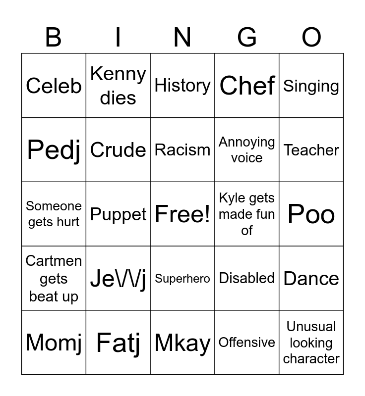This bingo card has a free space and 24 words: Je\/\/j, Fatj, Racism, Momj, Singing, Celeb, Pedj, Kenny dies, Kyle gets made fun of, Superhero, Annoying voice, Someone gets hurt, Disabled, Dance, Crude, Offensive, Poo, History, Teacher, Puppet, Unusual looking character, Cartmen gets beat up, Chef and Mkay.