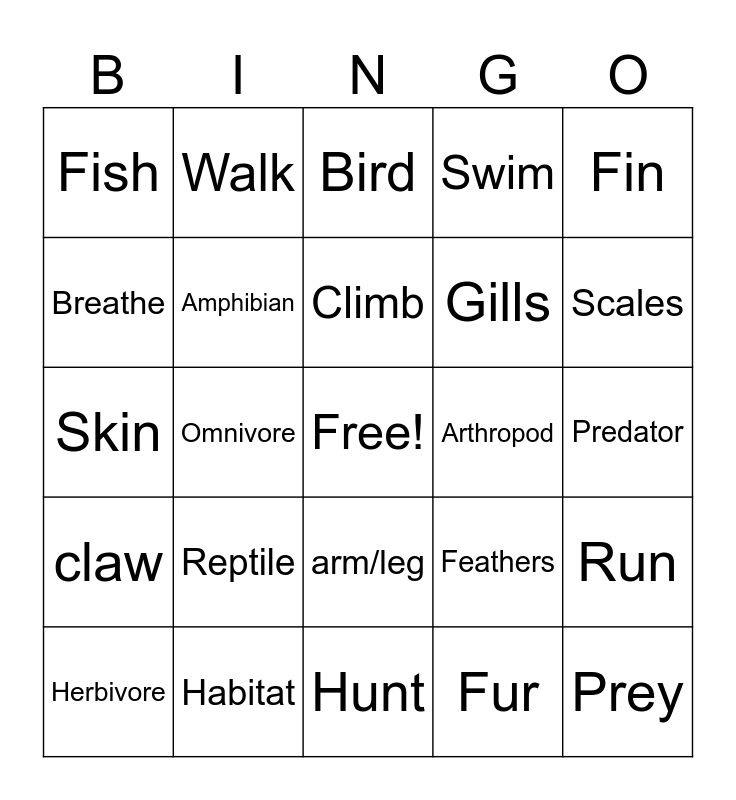 This bingo card has a free space and 29 words: Herbivore, Carnivore, Omnivore, Mammal, Fish, Bird, Amphibian, Reptile, Arthropod, Habitat, Predator, Prey, Hunt, Fur, Scales, Hair, arm/leg, claw, Fin, Skin, Feathers, Lungs, Gills, Breathe, Swim, Walk, Run, Climb and Swing.