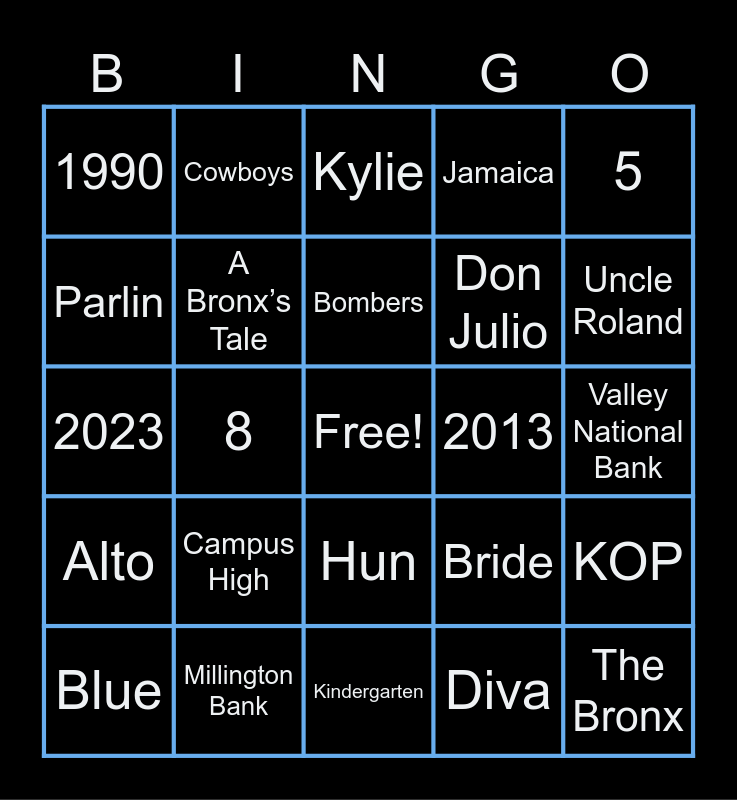 This bingo card has a free space and 29 words: Blue, 2018, 8, Hot Dogs, 1990, Kylie, A Bronx’s Tale, Campus High, 2013, Millington Bank, Valley National Bank, The Bronx, Kindergarten, Diva, Uncle Roland, Florida, Hun, Alto, 5, 2023, Bride, Groom, Don Julio, Parlin, Jamaica, Cowboys, KOP, Bombers and Blonde.