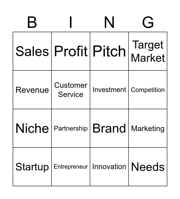 This bingo card has 16 words: Startup, Entrepreneur, Pitch, Target Market, Revenue, Profit, Brand, Marketing, Sales, Customer Service, Innovation, Competition, Niche, Partnership, Investment and Needs.