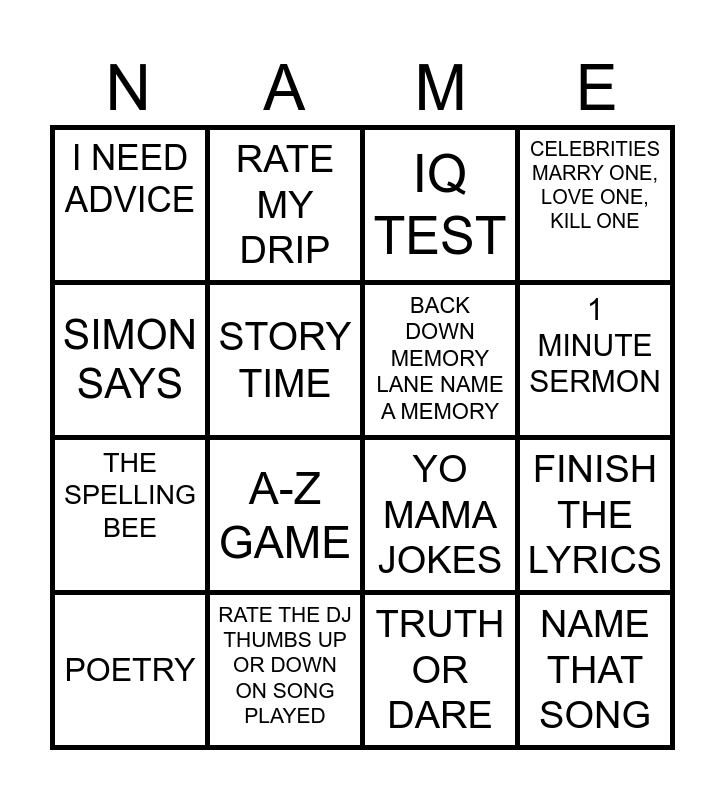 This bingo card has 24 words: HEALTH, QUESTIONS ABOUT THE BIBLE, TRUTH OR DARE, NAME THAT SONG, I NEED ADVICE, RATE MY DRIP, BACK DOWN MEMORY LANE NAME A MEMORY, CELEBRITIES MARRY ONE, LOVE ONE, KILL ONE, THE SPELLING BEE, RATE THE DJ THUMBS UP OR DOWN ON SONG PLAYED, GUESS THAT MOVIE LINE, 1 MINUTE SERMON, MY DREAM JOB, FREESTYLE RAP/SING, YO MAMA JOKES, VISUAL MAKEOVER, POETRY, STORY TIME, GUESS MY WEIGHT, HEIGHT, SHOE SIZE, ETC., FINISH THE LYRICS, SIMON SAYS, A-Z GAME, IQ TEST and MAKE ME LAUGH.