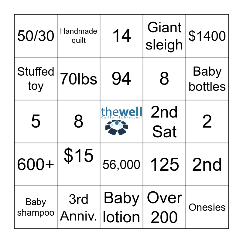 This bingo card has a free space and 24 words: $15, 3rd Anniv., 94, Baby shampoo, $1400, 50/30, Stuffed toy, Handmade quilt, 2nd Sat, 56,000, 8, 5, 125, 2nd, 70lbs, Over 200, 2, 14, Baby bottles, 8, Onesies, 600+, Giant sleigh and Baby lotion.