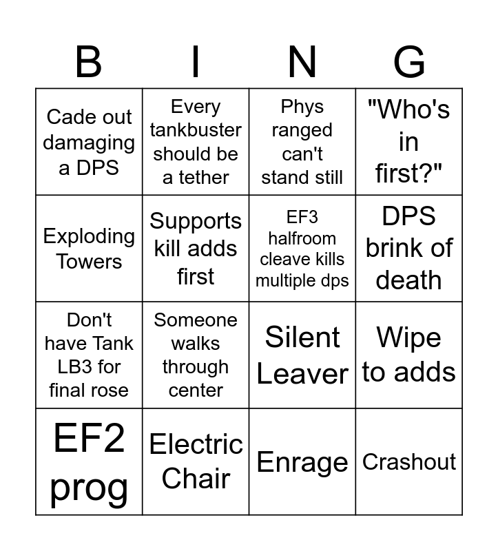 This bingo card has 16 words: EF2 prog, Electric Chair, Phys ranged can't stand still, "Who's in first?", Exploding Towers, Every tankbuster should be a tether, Silent Leaver, Wipe to adds, Cade out damaging a DPS, Supports kill adds first, Enrage, DPS brink of death, Don't have Tank LB3 for final rose, Someone walks through center, EF3 halfroom cleave kills multiple dps and Crashout.
