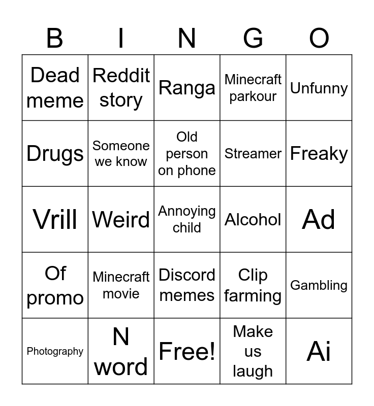 This bingo card has 25 words: Of promo, N word, Annoying child, Make us laugh, Unfunny, Dead meme, Reddit story, Ranga, Alcohol, Gambling, Drugs, Someone we know, Free!, Clip farming, Freaky, Photography, Weird, Old person on phone, Streamer, Ad, Vrill, Minecraft movie, Discord memes, Minecraft parkour and Ai.