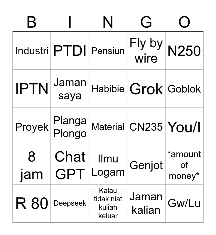 This bingo card has a free space and 24 words: Chat GPT, Deepseek, Habibie, R 80, N250, Industri, IPTN, PTDI, CN235, Ilmu Logam, Grok, Proyek, Genjot, *amount of money*, Jaman saya, Jaman kalian, You/I, Pensiun, Goblok, Planga Plongo, Gw/Lu, 8 jam, Fly by wire and Kalau tidak niat kuliah keluar.