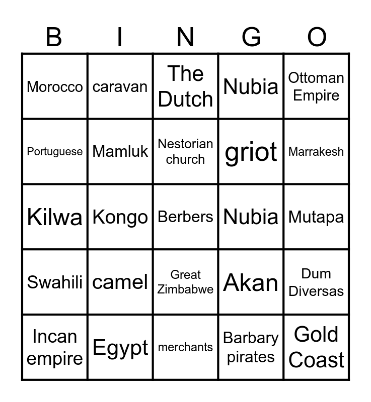 This bingo card has a free space and 24 words: camel, Egypt, Nestorian church, Incan empire, Ottoman Empire, Morocco, Portuguese, caravan, Nubia, Great Zimbabwe, griot, Kilwa, Akan, Dum Diversas, Mamluk, Barbary pirates, Mutapa, The Dutch, Marrakesh, Kongo, Gold Coast, Swahili, Nubia and merchants.