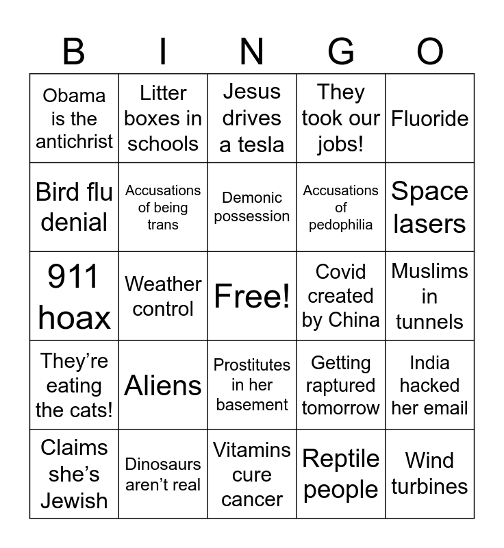 This bingo card has a free space and 24 words: Aliens, Dinosaurs aren’t real, Demonic possession, Claims she’s Jewish, Fluoride, Obama is the antichrist, Bird flu denial, Litter boxes in schools, Covid created by China, Prostitutes in her basement, Accusations of pedophilia, 911 hoax, Getting raptured tomorrow, India hacked her email, Accusations of being trans, Reptile people, Muslims in tunnels, Jesus drives a tesla, Space lasers, Weather control, Wind turbines, They’re eating the cats!, They took our jobs! and Vitamins cure cancer.