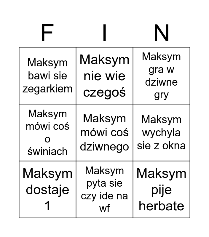 This bingo card has a free space and 8 words: Maksym wychyla sie z okna, Maksym gra w dziwne gry, Maksym nie wie czegoś, Maksym dostaje 1, Maksym bawi sie zegarkiem, Maksym pije herbate, Maksym mówi coś o świniach and Maksym pyta sie czy ide na wf.