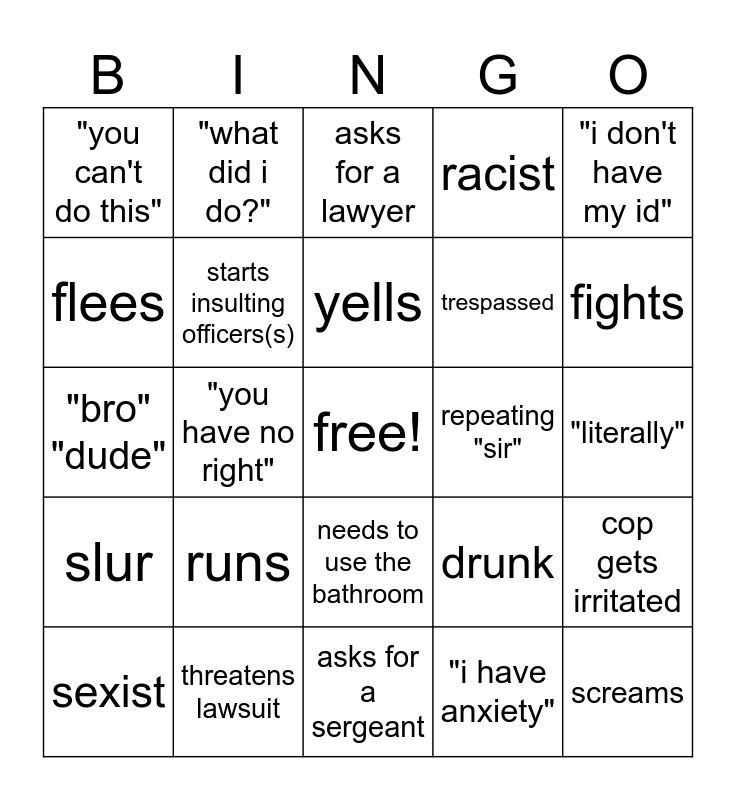 This bingo card has a free space and 44 words: "i didn't do anything!", screams, refuses to give name, sexist, asks for name or badge number, "i have anxiety", asks for a lawyer, "i'm not drunk", "i don't have my id", threatens lawsuit, racist, repeating "sir", needs to use the bathroom, runs, "my _ is a cop!", asks for a sergeant, wants cuffs loosened /taken off, "bro" "dude", uses their kids as an excuse, fights, "what did i do?", "i want to call my dad", friend asking them to stop, "you can't do this", take me to jail, "literally", is on the phone, asks to leave, drunk, slur, refuses to leave, cop gets irritated, cop starts yelling, threatens job, "you have no right", "i know _", "i know my rights", "shut up", yells, flees, trespassed, "i need to go home", starts insulting officers(s) and spits.