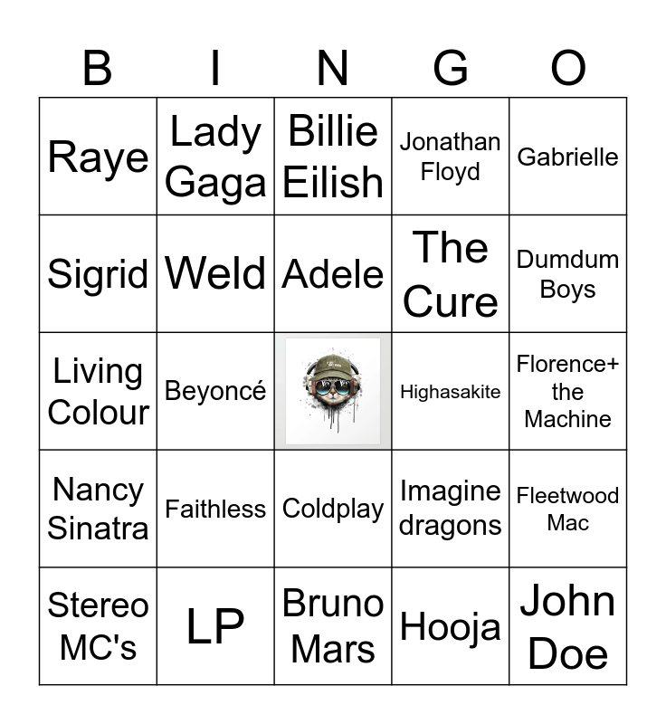 This bingo card has a free space and 24 words: Faithless, LP, Adele, Stereo MC's, Gabrielle, Raye, Sigrid, Lady Gaga, Highasakite, Coldplay, The Cure, Living Colour, Imagine dragons, Fleetwood Mac, Weld, Hooja, Florence+ the Machine, Billie Eilish, Dumdum Boys, Beyoncé, John Doe, Nancy Sinatra, Jonathan Floyd and Bruno Mars.