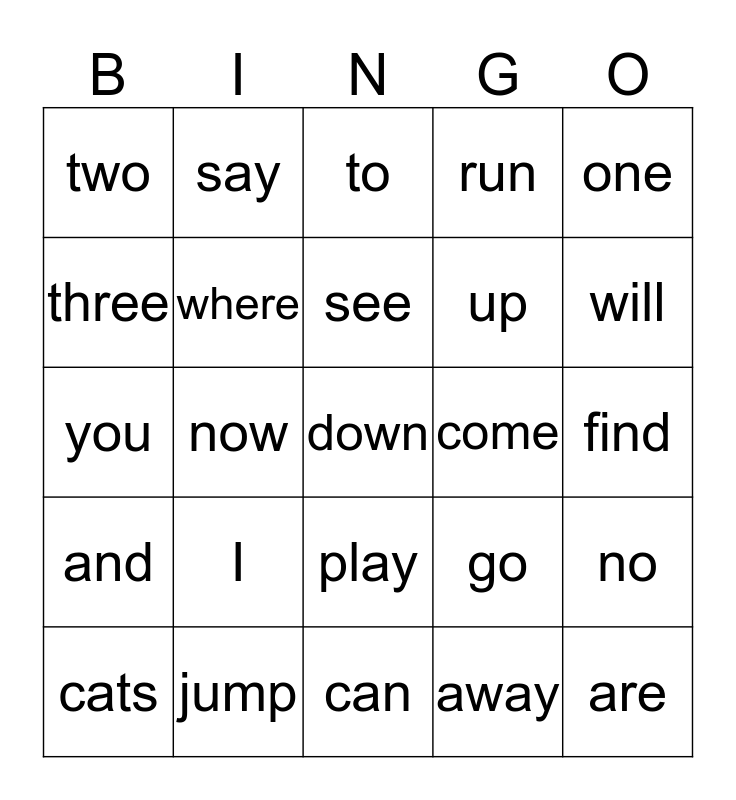 This bingo card has 25 words: I, can, see, cats, one, two, three, say, come, play, up, you, go, no, where, are, find, to, will, now, down, jump, and, run and away.