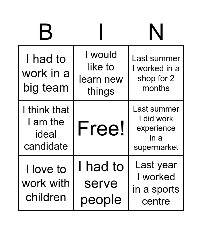 This bingo card has a free space and 14 words: I worked as a waiter, I would like to work with people, I love to work with children, I would like to learn new things, I think that I am the ideal candidate, Last year I worked in a sports centre, Last year I did work experience in a school, One year ago I worked in a restaurant, I had to serve people, I had to work in a big team, I had to organise activities for children, Last summer I did work experience in a supermarket, Last summer I worked in a shop for 2 months and Last year i worked in a restaurant for a month.