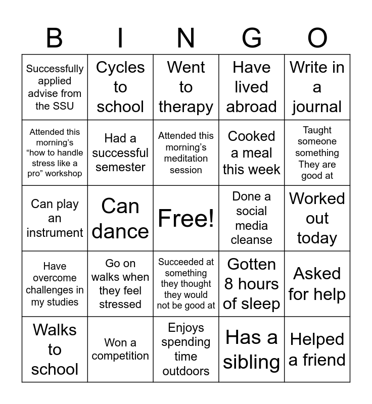 This bingo card has a free space and 24 words: Go on walks when they feel stressed, Won a competition, Attended this morning’s meditation session, Walks to school, Write in a journal, Successfully applied advise from the SSU, Attended this morning’s “how to handle stress like a pro” workshop, Cycles to school, Done a social media cleanse, Succeeded at something they thought they would not be good at, Cooked a meal this week, Can play an instrument, Gotten 8 hours of sleep, Asked for help, Had a successful semester, Has a sibling, Worked out today, Went to therapy, Taught someone something They are good at, Can dance, Helped a friend, Have overcome challenges in my studies, Have lived abroad and Enjoys spending time outdoors.