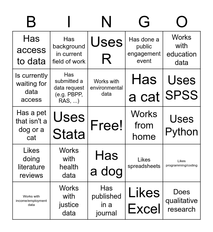 This bingo card has a free space and 24 words: Works with health data, Works with justice data, Works with environmental data, Works with income/employment data, Works with education data, Has access to data, Is currently waiting for data access, Has background in current field of work, Works from home, Has a dog, Has a cat, Has a pet that isn't a dog or a cat, Likes spreadsheets, Likes programming/coding, Has submitted a data request (e.g. PBPP, RAS, ...), Likes Excel, Uses Python, Uses R, Uses SPSS, Uses Stata, Does qualitative research, Likes doing literature reviews, Has done a public engagement event and Has published in a journal.