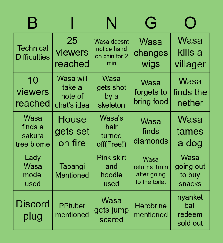 This bingo card has a free space and 52 words: Wasa is muted, nyanket ball redeem sold out, Wasa Rizz Redeem, Wasa gets jump scared, Tabangi Mentioned, Wasa showered, 25 viewers reached, 15 viewers reached, 10 viewers reached, Wasa gets rickrolled, Wasa will take a note of chat's idea, Wasa craving for Jollibee, Wasa going out to buy snacks, Wasa returns 1min after going to the toilet, Wasa forgets to mute mic when talking to her roomie, Wasa dies of fall damage in minecraft, Wasa gets shot by a skeleton, Wasa finds diamonds, Creeper jump scare, Wasa kills a villager, House gets set on fire, Herobrine mentioned, Technical Difficulties, Wasa forgets to bring food, Wasa falls from a high place, Wasa makes a sad girl line, Sus camera angle, Sus line by wasa/chatters, Wasa finds the nether, Chicken joy mentioned, Jack black mentioned, Wasa changes wigs, Wasa forgets what she was doing, Sushi Plushie appears, Wasabae Sushi is redeemed, Wasa doesnt notice hand on chin for 2 min, PPtuber mentioned, Wasa does OIIAIOIIIAI, Wasa’s face on your screen, Wasa steals heyowe’s glasses, Momshie appears, Wasa tames a dog, Lady Wasa model used, Ichigo appears, Pink skirt and hoodie used, Wasa gets raided on stream, Someone subs or gifts a sub, Wasa finds a sakura tree biome, Wasa builds a house, Wasa didnt shower, Discord plug and Wasa gets jump scared.