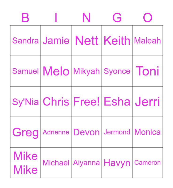 This bingo card has a free space and 24 words: Adrienne, Michael, Mikyah, Mike Mike, Maleah, Sandra, Samuel, Jamie, Esha, Devon, Syonce, Sy'Nia, Jermond, Monica, Melo, Havyn, Jerri, Nett, Toni, Chris, Cameron, Greg, Keith and Aiyanna.