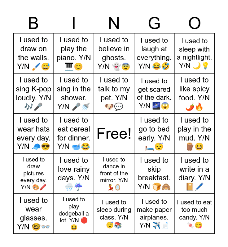 This bingo card has a free space and 33 words: I used to play soccer often. Y/N β½π, I used to watch cartoons every morning. Y/N πΊπ, I used to eat cereal for dinner. Y/N π₯£π, I used to ride a bike to school. Y/N π²π«, I used to draw pictures every day. Y/N π¨ποΈ, I used to sing in the shower. Y/N π€πΏ, I used to sleep with a nightlight. Y/N ππ‘, I used to wear glasses. Y/N π€π, I used to play the piano. Y/N πΉπ, I used to hate vegetables. Y/N π₯¦π, I used to talk to my pet. Y/N πΆπ¬, I used to believe in ghosts. Y/N π»π¨, I used to run around the playground. Y/N πββοΈποΈ, I used to read comic books. Y/N ππ, I used to go to bed early. Y/N ποΈπ΄, I used to like spicy food. Y/N πΆοΈπ₯, I used to play dodgeball a lot. Y/N π΄π, I used to wear hats every day. Y/N π§’π, I used to love rainy days. Y/N π§οΈβ, I used to skip breakfast. Y/N ππ, I used to dance in front of the mirror. Y/N ππͺ, I used to play with dolls. Y/N π§Έπ§, I used to draw on the walls. Y/N ποΈπ , I used to play in the mud. Y/N πͺ΅π, I used to sleep during class. Y/N π΄π, I used to eat too much candy. Y/N π¬π, I used to laugh at everything. Y/N ππ€£, I used to get scared of the dark. Y/N ππ±, I used to sing K-pop loudly. Y/N πΆπ€, I used to write in a diary. Y/N πποΈ, I used to chase my friends around. Y/N ππ, I used to make paper airplanes. Y/N βοΈπ and I used to wear cry when Joyce was angry. Y/N π§¦π€ͺ.