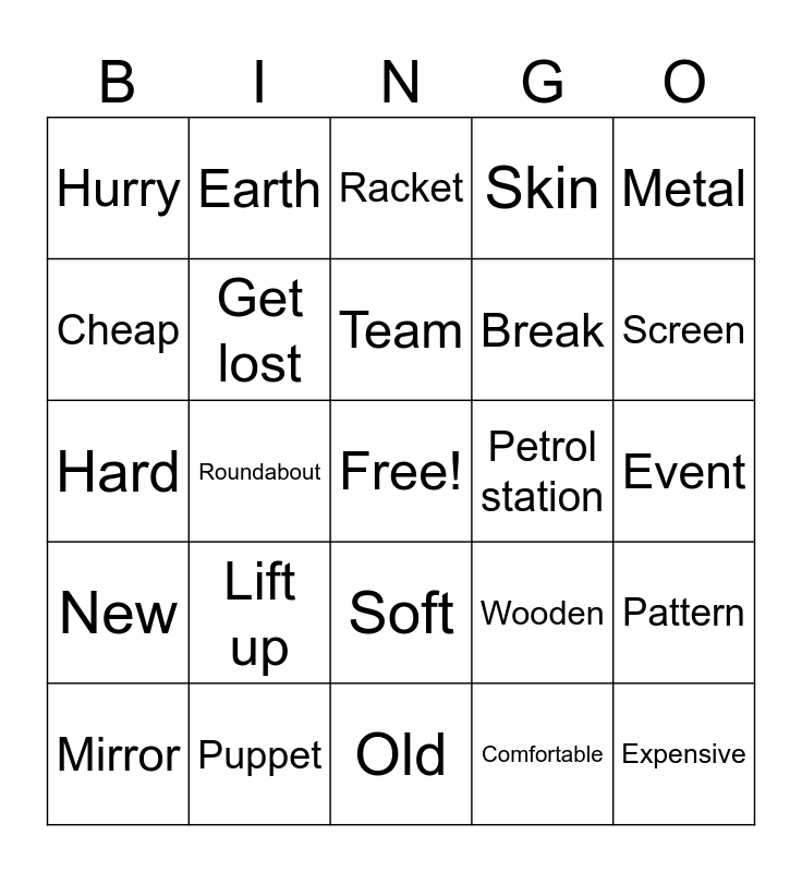 This bingo card has a free space and 29 words: Mirror, Traffic light, Roundabout, Kick, Hurry, Racket, Get lost, Lift up, Petrol station, Puppet, Event, Expensive, Old, Comfortable, Screen, Repair, Soft, New, Metal, Hard, Wooden, Modern, Break, Cheap, Skin, Earth, Pattern, Team and Trophy.