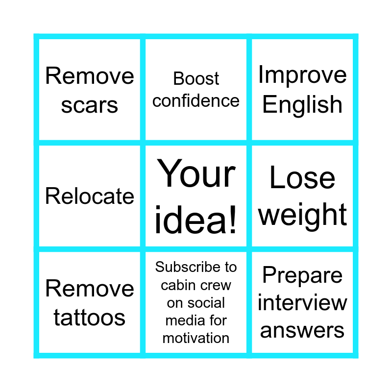 This bingo card has a free space and 8 words: Lose weight, Improve English, Boost confidence, Remove tattoos, Remove scars, Prepare interview answers, Relocate and Subscribe to cabin crew on social media for motivation.