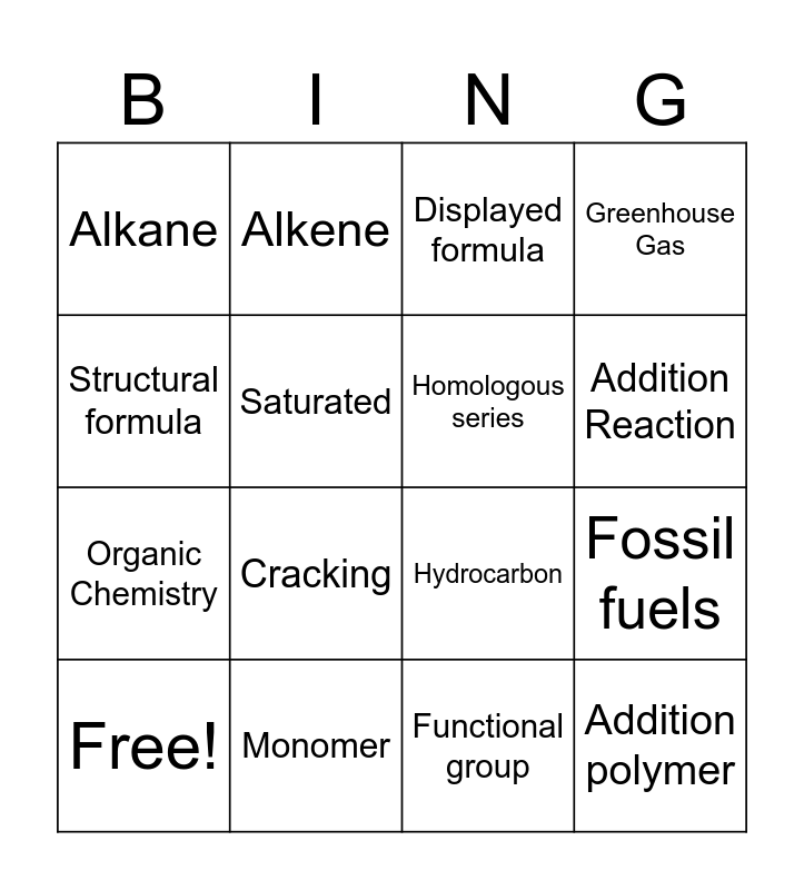 This bingo card has 23 words: Addition polymer, Volatile, Addition Reaction, Unsaturated, Structural formula, Alkane, Saturated, Alkene, Free!, Polymer, Cracking, Organic Chemistry, Non-renewable, Dibromoalkane, Monomer, Isomer, Displayed formula, Hydrocarbon, Homologous series, Fossil fuels, Greenhouse Gas, Functional group and General formula.