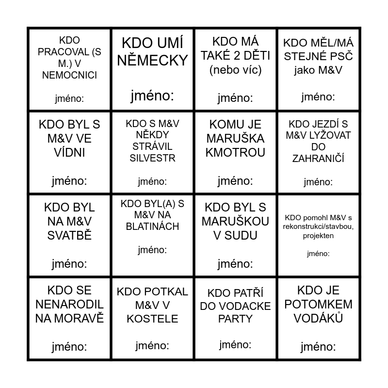 This bingo card has 16 words: KDO POTKAL M&V V KOSTELE jméno:, KDO pomohl M&V s rekonstrukci/stavbou, projekten jméno:, KDO MÁ TAKÉ 2 DĚTI (nebo víc) jméno:, KDO PRACOVAL (S M.) V NEMOCNICI jméno:, KDO BYL NA M&V SVATBĚ jméno:, KDO UMÍ NĚMECKY jméno:, KDO BYL S MARUŠKOU V SUDU jméno:, KDO PATŘÍ DO VODACKE PARTY jméno:, KDO BYL S M&V VE VÍDNI jméno:, KDO S M&V NĚKDY STRÁVIL SILVESTR jméno:, KDO SE NENARODIL NA MORAVĚ jméno:, KDO MĚL/MÁ STEJNÉ PSČ jako M&V jméno:, KDO BYL(A) S M&V NA BLATINÁCH jméno:, KDO JEZDÍ S M&V LYŽOVAT DO ZAHRANIČÍ jméno:, KOMU JE MARUŠKA KMOTROU jméno: and KDO JE POTOMKEM VODÁKŮ jméno:.