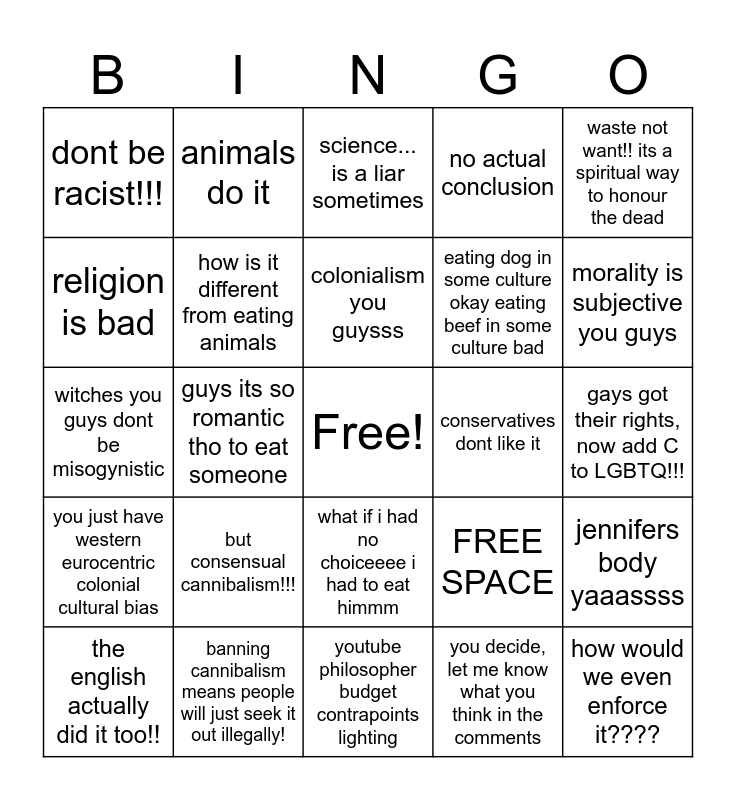This bingo card has a free space and 25 words: but consensual cannibalism!!!, youtube philosopher budget contrapoints lighting, colonialism you guysss, the english actually did it too!!, waste not want!! its a spiritual way to honour the dead, dont be racist!!!, religion is bad, animals do it, conservatives dont like it, what if i had no choiceeee i had to eat himmm, eating dog in some culture okay eating beef in some culture bad, witches you guys dont be misogynistic, FREE SPACE, jennifers body yaaassss, how is it different from eating animals, it tastes like pork!!!, gays got their rights, now add C to LGBTQ!!!, science... is a liar sometimes, morality is subjective you guys, guys its so romantic tho to eat someone, how would we even enforce it????, banning cannibalism means people will just seek it out illegally!, you just have western eurocentric colonial cultural bias, no actual conclusion and you decide, let me know what you think in the comments.