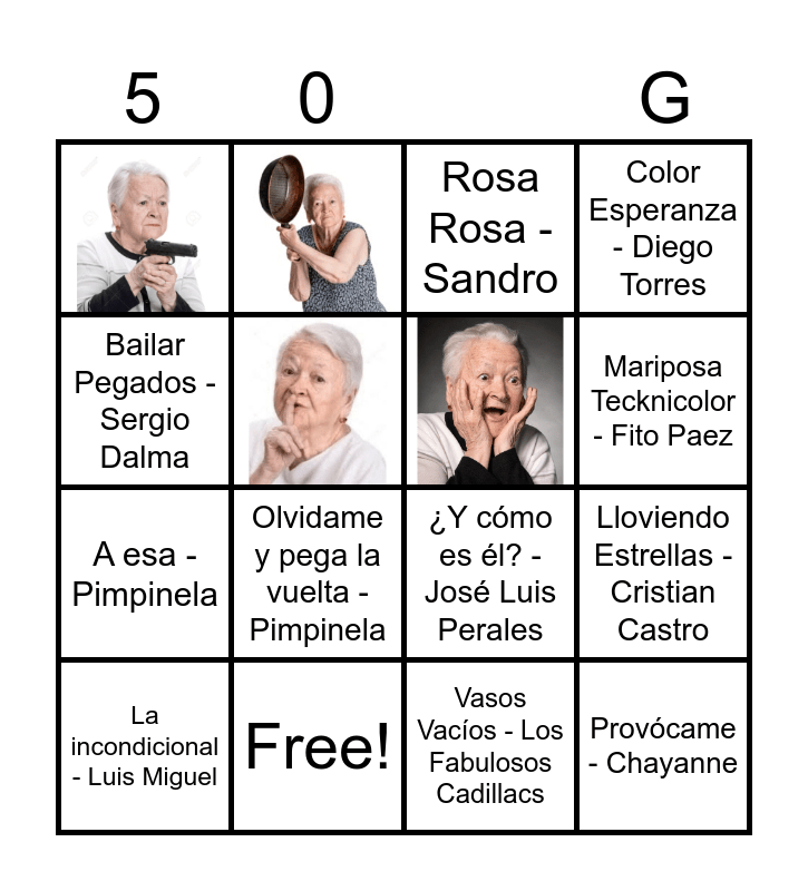 This bingo card has 6 images and 16 words: Free!, Rosa Rosa - Sandro, ¿Y cómo es él? - José Luis Perales, Provócame - Chayanne, A esa - Pimpinela, Color Esperanza - Diego Torres, Despeinada - Palito Ortega, Después de Ti - Alejandro Lerner, Vasos Vacíos - Los Fabulosos Cadillacs, Un beso y una Flor - Nino Bravo, Lloviendo Estrellas - Cristian Castro, La incondicional - Luis Miguel, Olvidame y pega la vuelta - Pimpinela, Bailar Pegados - Sergio Dalma, Mariposa Tecknicolor - Fito Paez and Señor amante - Valeria Lynch.