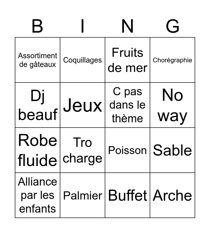This bingo card has 16 words: Palmier, Sable, Fruits de mer, Assortiment de gâteaux, Robe fluide, Coquillages, Poisson, Buffet, Dj beauf, Jeux, Alliance par les enfants, Chorégraphie, Tro charge, No way, C pas dans le thème and Arche.