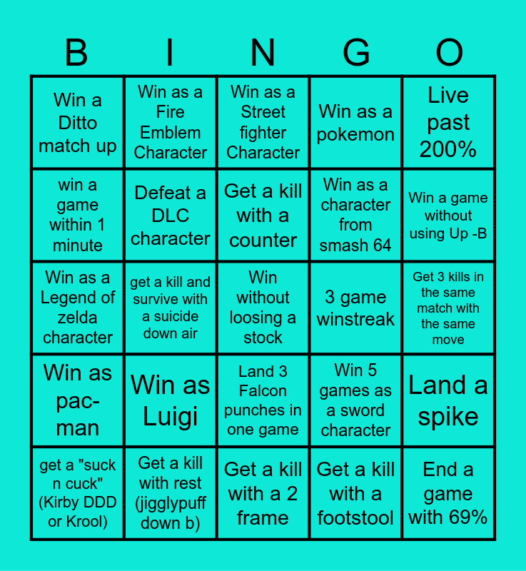 This bingo card has a free space and 24 words: get a "suck n cuck" (Kirby DDD or Krool), Win as Luigi, Get a kill with a counter, Get a kill with a footstool, Live past 200%, Win a Ditto match up, Win as a Fire Emblem Character, Win as a Street fighter Character, 3 game winstreak, Get 3 kills in the same match with the same move, Win as a Legend of zelda character, Defeat a DLC character, Win 5 games as a sword character, Land a spike, win a game within 1 minute, Get a kill with rest (jigglypuff down b), Get a kill with a 2 frame, Win as a pokemon, Win a game without using Up -B, Win as pac-man, get a kill and survive with a suicide down air, Land 3 Falcon punches in one game, Win as a character from smash 64 and End a game with 69%.