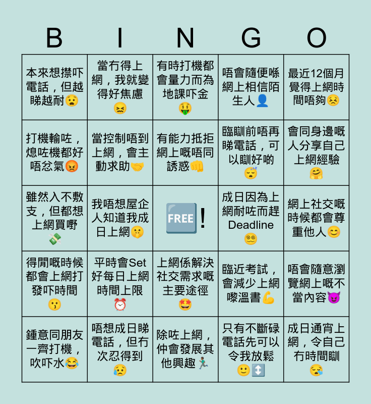 This bingo card has a free space and 24 words: 平時會Set好每日上網時間上限⏰, 唔想成日睇電話,但冇次忍得到😥, 有能力抵拒網上嘅唔同誘惑👊, 鍾意同朋友一齊打機,吹吓水😂, 最近12個月覺得上網時間唔夠😣, 本來想㩒吓電話,但越睇越耐😧, 打機輸咗,熄咗機都好唔忿氣😡, 當冇得上網,我就變得好焦慮😖, 成日因為上網耐咗而趕Deadline😵💫, 上網係解決社交需求嘅主要途徑🤩, 臨瞓前唔再睇電話,可以瞓好啲😴, 雖然入不敷支,但都想上網買嘢💸, 臨近考試,會減少上網嚟溫書💪, 唔會隨意瀏覽網上嘅不當內容😈, 當控制唔到上網,會主動求助🤝, 只有不斷碌電話先可以令我放鬆🙂↕️, 網上社交嘅時候都會尊重他人😊, 有時打機都會量力而為地課吓金🤑, 會同身邊嘅人分享自己上網經驗🤗, 我唔想屋企人知道我成日上網🤫, 成日通宵上網,令自己冇時間瞓😪, 得閒嘅時候都會上網打發吓時間😗, 唔會隨便喺網上相信陌生人👤 and 除咗上網,仲會發展其他興趣🏃🏾♂️.