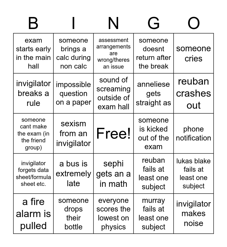 This bingo card has a free space and 29 words: a fire alarm is pulled, lucas bain gets straight As, sexism from an invigilator, sephi gets a nosebleed, exam starts early in the main hall, assessment arrangements are wrong/theres an issue, impossible question on a paper, a bus is extremely late, someone is kicked out of the exam, someone drops their bottle, phone notification, invigilator makes noise, everyone scores the lowest on physics, murray fails at least one subject, reuban crashes out, exam starts late in the main hall, sephi gets an a in math, invigilator forgets data sheet/formula sheet etc., someone cries, someone cant make the exam (in the friend group), reuban fails at least one subject, someone has to leave due to illness, anneliese gets straight as, invigilator breaks a rule, someone doesnt return after the break, someone brings a calc during non calc, lukas blake fails at least one subject, sound of screaming outside of exam hall and stomach noises or farting is scarily loud.